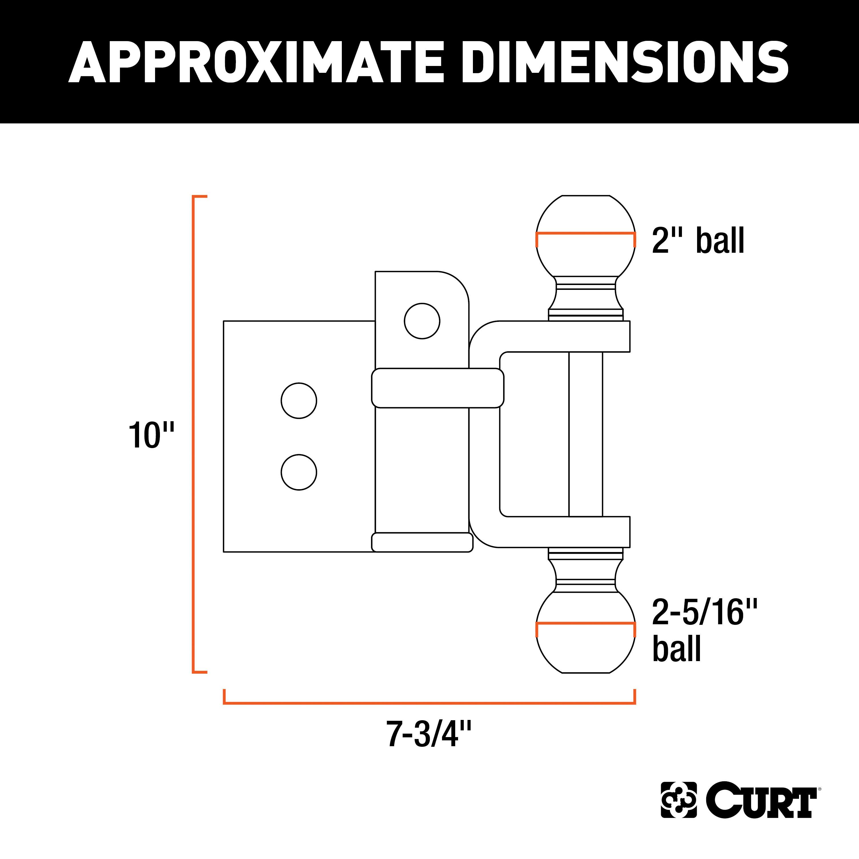 If you own multiple trailers or frequently tow a variety of loads, you know how much time and money are spent tailoring your towing system to each and every individual trailer. There is nothing more inconvenient than switching back and forth between a few different ball mounts and trying to remember which mount fits with which trailer. A CURT adjustable ball mount is your multipurpose towing solution. This CURT adjustable ball mount fits an adjustable shank size of 2" x 2" and features two different trailer ball sizes to accommodate two different coupler sizes: 2" and 2-5/16". The 2" trailer ball offers a gross trailer weight capacity of 7,500 lbs. and a tongue weight capacity of 750 lbs., while the 2-5/16" ball offers 10,000 lbs. GTW and 1,000 lbs. TW. This allows you to easily tow a variety of heavyweight trailers and to ensure that each one tows smoothly and securely. It includes three 5/8" hitch pins for quick and secure installation, and comes equipped with a clevis bar to accept a lunette ring. All CURT adjustable ball mounts are made with sturdy steel construction and come with a durable powder coat finish for long-lasting rust, scratch and UV resistance.