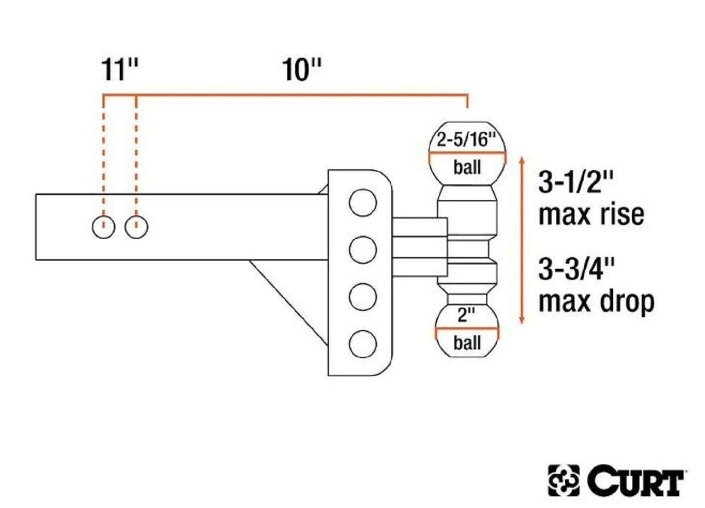 If you own multiple trailers or frequently tow a variety of loads, you know how much time and money are spent tailoring your towing system to each and every individual trailer. There is nothing more inconvenient than switching back and forth between a few different ball mounts and trying to remember which mount fits with which trailer. A CURT adjustable ball mount is your multipurpose towing solution. The CURT slim adjustable channel-style ball mount provides a weight capacity of up to 10,000 pounds and only weighs 15 pounds. It has a shank size of 2 inches x 2 inches and features two different trailer ball sizes to accommodate two different coupler sizes: 2-inch and 2-5/16-inch. It also features an adjustable shank assembly with multiple mounting holes for varying ball heights. Each trailer ball can be raised to a maximum of 3-1/2-inch rise or lowered to a maximum of 3-3/4-inch drop, allowing you to make your trailer completely level in any towing situation. The CURT slim adjustable ballmount offers a gross trailer weight capacity of up to 8,000 pounds for the 2-inch ball and 10,000 pounds for the 2-5/16-inch ball. It allows you to tow a variety of trailers, and it features two pin holes in the shank to be mounted at an 10-inch or 11-inch length. All CURT channel-style adjustable hitches are made with sturdy steel construction and come with a black carbide powder coat finish for long-lasting rust, scratch and UV resistance.